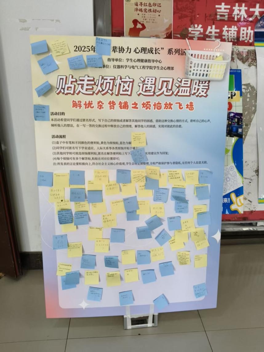 为助力新生平稳度过入学适应期,缓解心理压力,在轻松的氛围中实现自我探索与成长,在吉林大学学生心理健康指导中心的指导下,学院团委的支持下,仪器科学与电气工程学院学生会心理部于2025年11月18日至11月25日在李四光教学楼顺利举办了“敞开心扉,放飞烦恼”心理解忧活动。