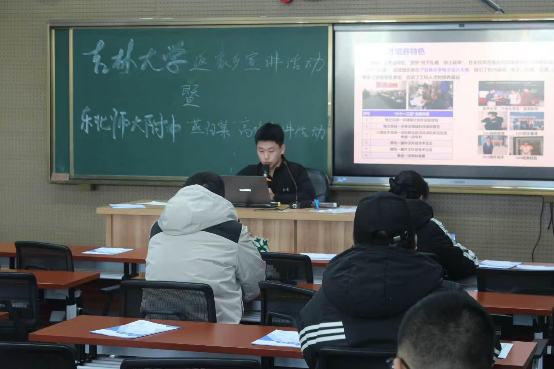 宣讲当日,团队成员以朋辈分享者的亲切姿态走进东北师大附中校园。宣讲团队全面展示吉林大学“双一流”建设成果、学科优势与校园学习生活环境;重点讲解仪器科学与电气工程学院的学科特色、科研平台、师资力量及保研考研就业前景;最后设置互动答疑环节,耐心解答学生和家长的实际问题。团队成员将吉林大学的学术底蕴与仪电学院的创新活力娓娓道来。互动环节气氛热烈,学弟学妹们踊跃提问,团队成员实事求是、耐心解答,展现出吉大学子严谨求实、真诚友善的良好风貌。