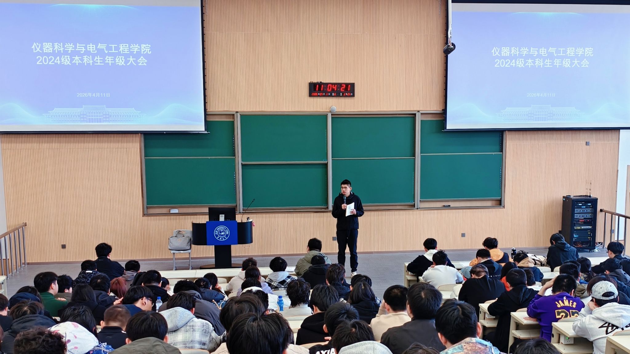 为进一步加强学生日常管理,筑牢安全防线,引导学生养成良好的学习生活习惯,4月11日,仪器科学与电气工程学院2024级本科生年级大会在李四光教学楼第二阶梯教室召开。本次大会由学院辅导员王文轩主持,2024级全体本科生参加。