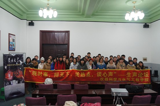 为进一步学习贯彻党的十八大精神,认真开展“我的中国梦”教育实践活动,围绕青年学生关注的热点焦点及时事问题,充分运用学术的逻辑、历史的逻辑和现实的逻辑教育引导青年学生,努力为青年学生搭建合理表达、畅谈心声的良好平台,培养学生的思辨能力和语言表达能力,不断引导广大青年学生树立正确的人生观、世界观和价值观,仪器科学与电气工程学院团委组织策划了“生声论坛”系列活动。2013年12月1日,第一期“生声论坛”活动在朝阳校区地质宫208室举行,此次活动由学生会秘书部承办,学院2011级同学参加了此次活动。